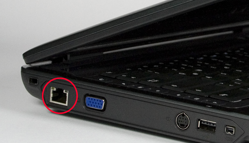 У ноутбуков порт сетевой карты обычно находится сбоку - справа или слева