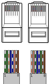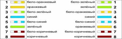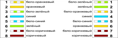 2.Аккуратно расплетаем эти цветные проводки, разводим их и располагаем ровненько в такой последовательности, как показано на картинке ниже (слева – один конец кабеля, справа – другой конец). Эта схема называется кроссовер (crossover) и используется только для соединения ДВУХ компьютеров между собой.